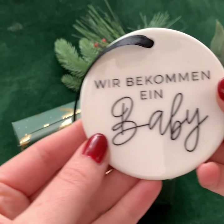 Stell dir vor, du überraschst deine Eltern, die Schwiegereltern oder auch deine beste Freundin mit einem Weihnachtsanhänger, auf dem steht: "Wir bekommen ein Baby". Diese zauberhaften runden Anhänger sind etwa 7 cm im Durchmesser und eignen sich perfekt, um die freudige Nachricht stilvoll zu verkünden.